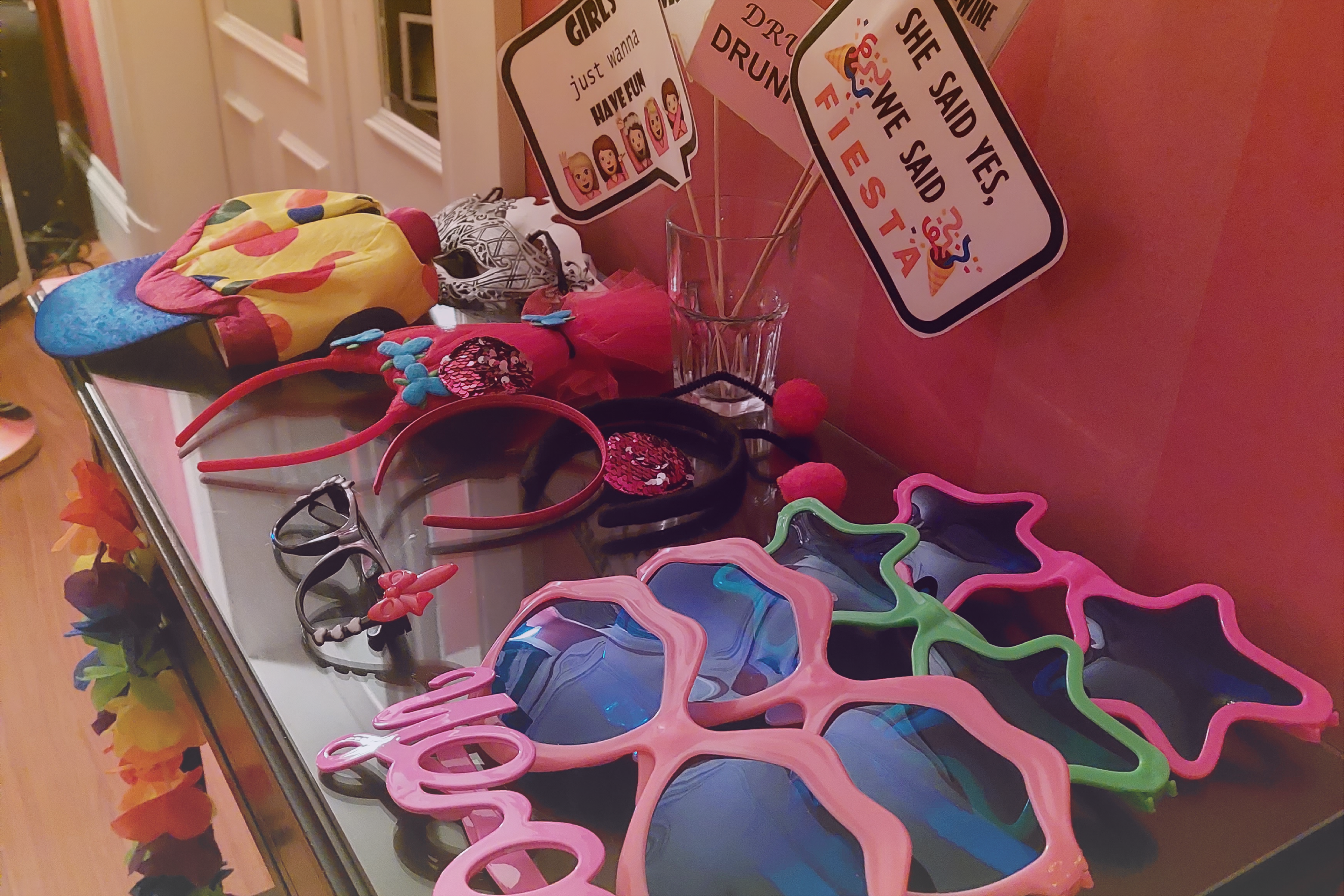 Sacos de acessórios extra colocados por mesa para animar os convidados na altura do baile.